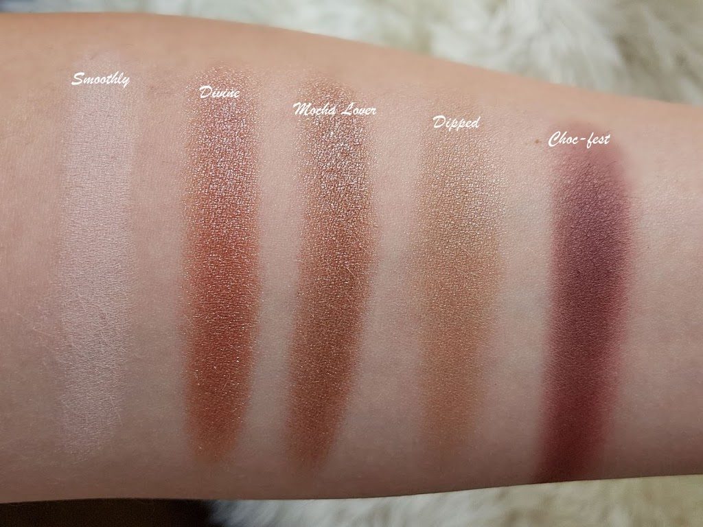 Smoothly has a semi-matte finish, it`s the first eyeshadow from the left and I use it as a base and highlighter for the brow arch. Divine is dark shimmery rose gold, Mocha Lover shimmery bronze, and Dipped is shimmery as well, but without pink undertone. Choco Fest is beautiful deep chocolate-burgundy color, matte finish, but not so blendable as the others.